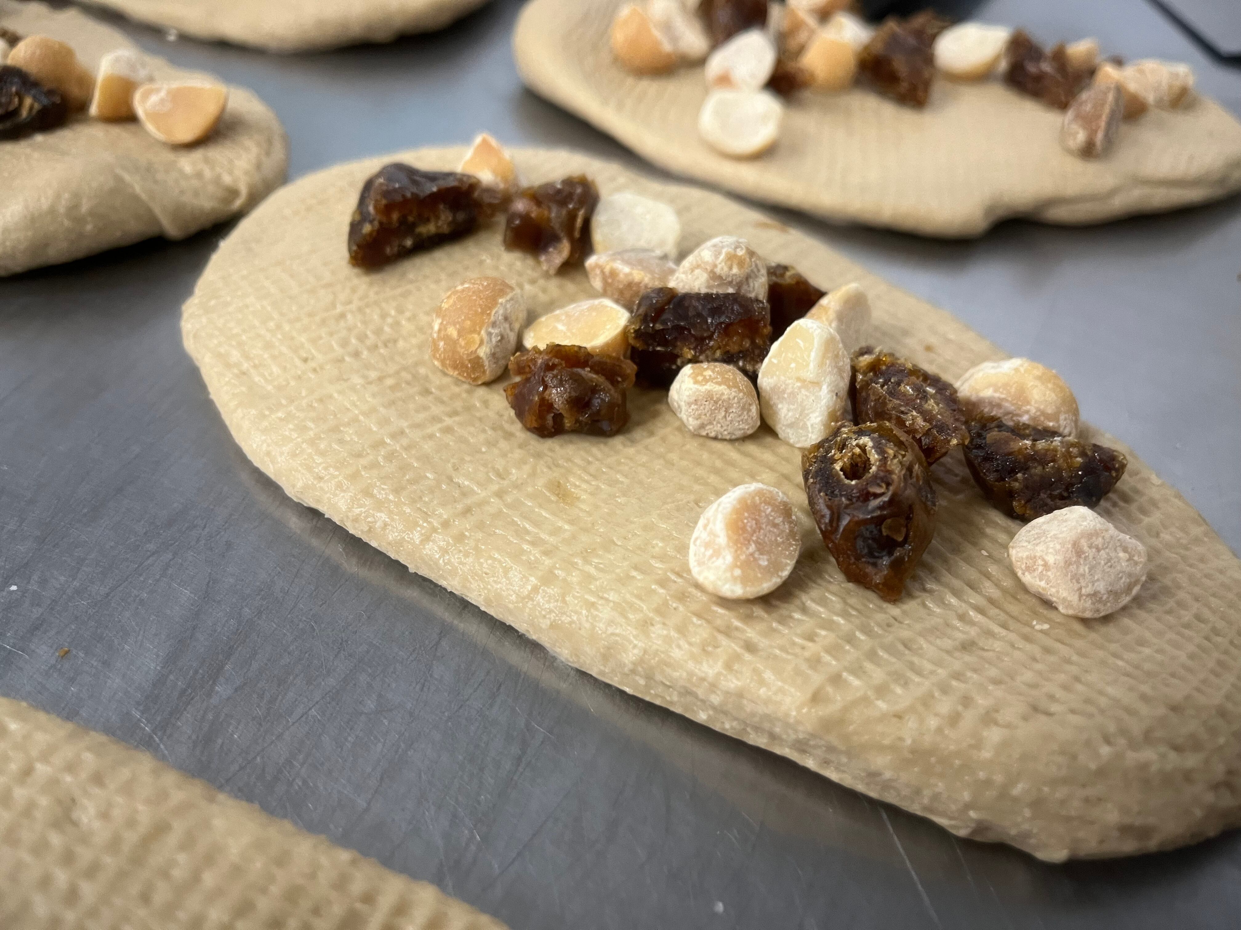 6 珈琲キャラメルマカダミアナッツ(珈琲生地にキャラメルのようなコクのあるデーツとマカダミアナッツを巻き込んだシンプルなベーグル)