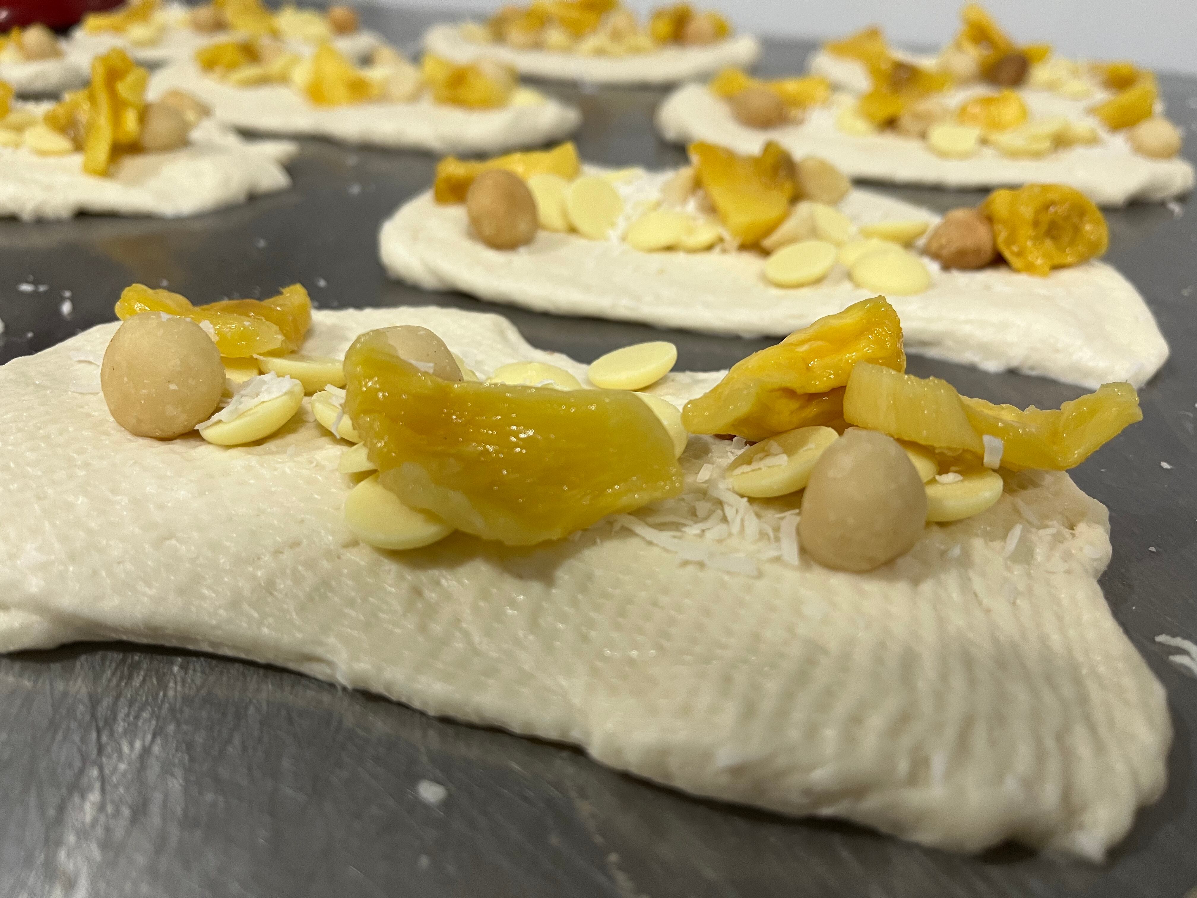 5ココナツパインマカダミアナッツ(店主のおすすめ!ココナツ練り込み生地に自家製ドライパイン、ホワイトチョコ、マカダミアナッツを巻き込みました)