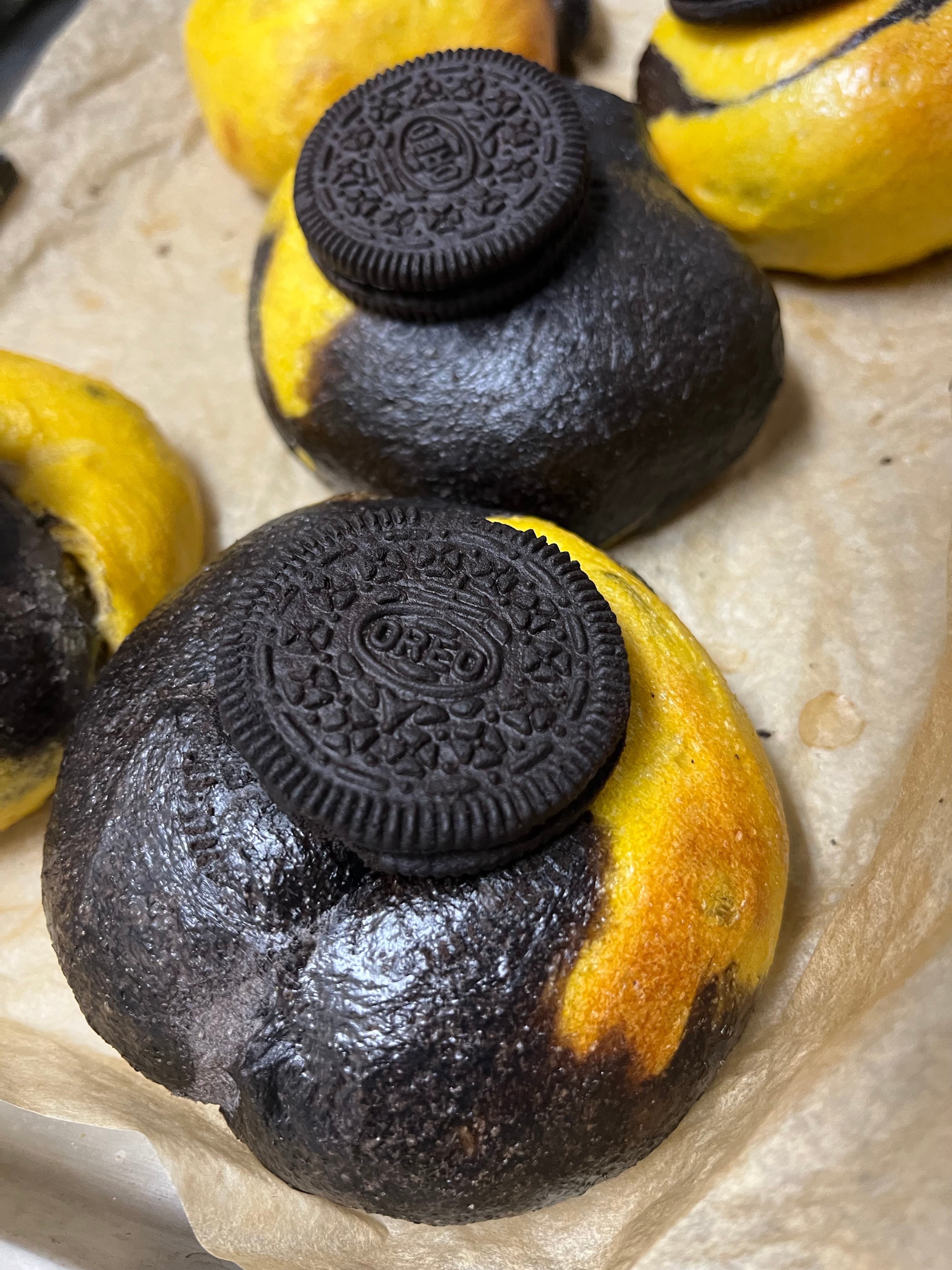 (10月限定ベーグル!かぼちゃとブラックココアのマーブル生地に自家製かぼちゃチーズケーキとオレオを巻き込みました。チーズケーキには米粉とラカンカを使用し、ヘルシーに仕上げています。)